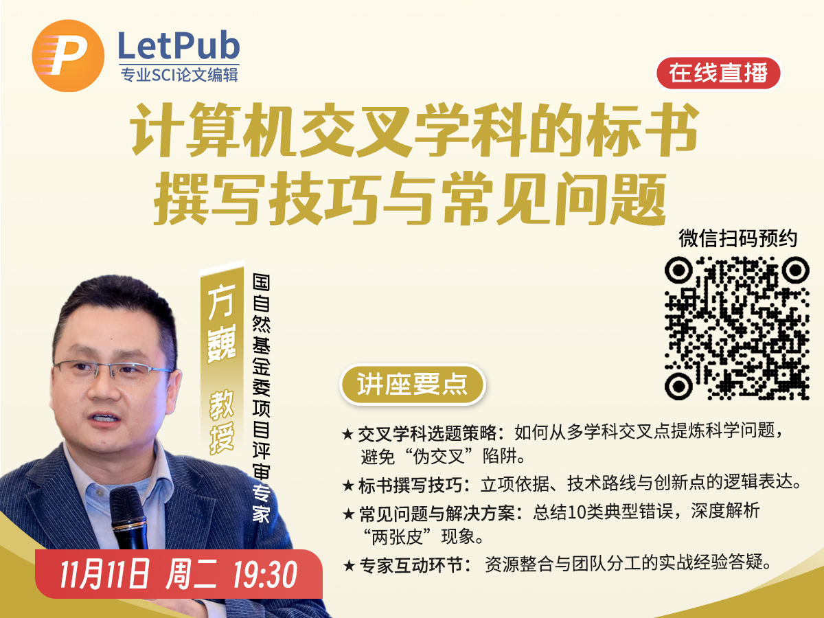 11月11日周二19:30,LetPub特邀国家自然科学基金委项目评审专家方巍教授,围绕交叉学科标书中常见的“创新点定位模糊”“技术路线描述不清”等问题,带来一场系统、实用的专题讲座,助您掌握交叉学科标书撰写的核心方法论,提升申报质量与中标成功率。