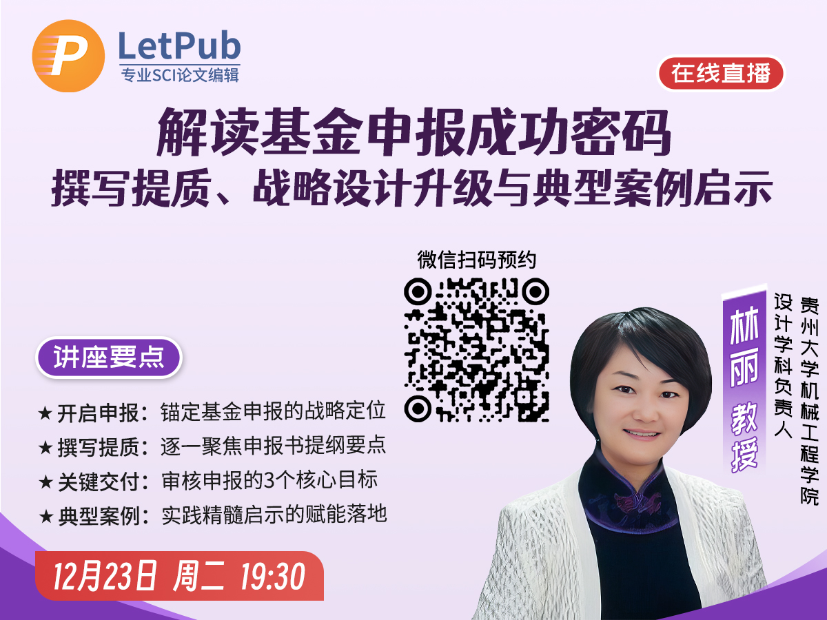 12月23日(周二)19:30,LetPub 特邀贵州大学机械工程学院设计学科负责人林丽教授,深度解读基金申报“成功密码”。林老师将结合多项基金项目申报与评审经验,讲解从战略价值锚定、学术逻辑构建及创新价值论证三个维度,系统拆解基金申报书的成功密码,并结合典型案例,助力研究者打造兼具“学术深度”与“战略高度”的申报文本。
