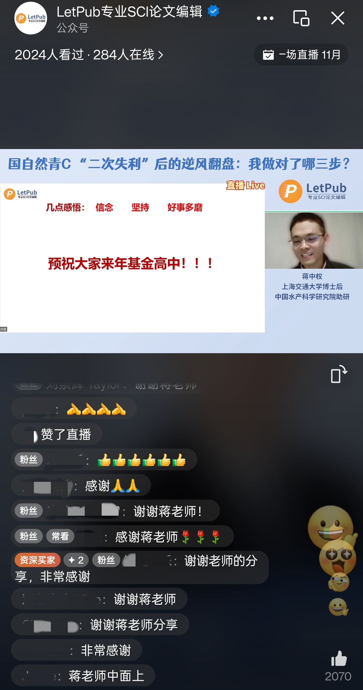 为帮助广大科研人员应对申报过程中可能遭遇的问题,LetPub精心策划了《国家自然科学基金申报攻略》系列线上辅导讲座。自2023年11月以来,我们已成功举办百余场线上免费直播,吸引了100万+名听众,反响热烈。
