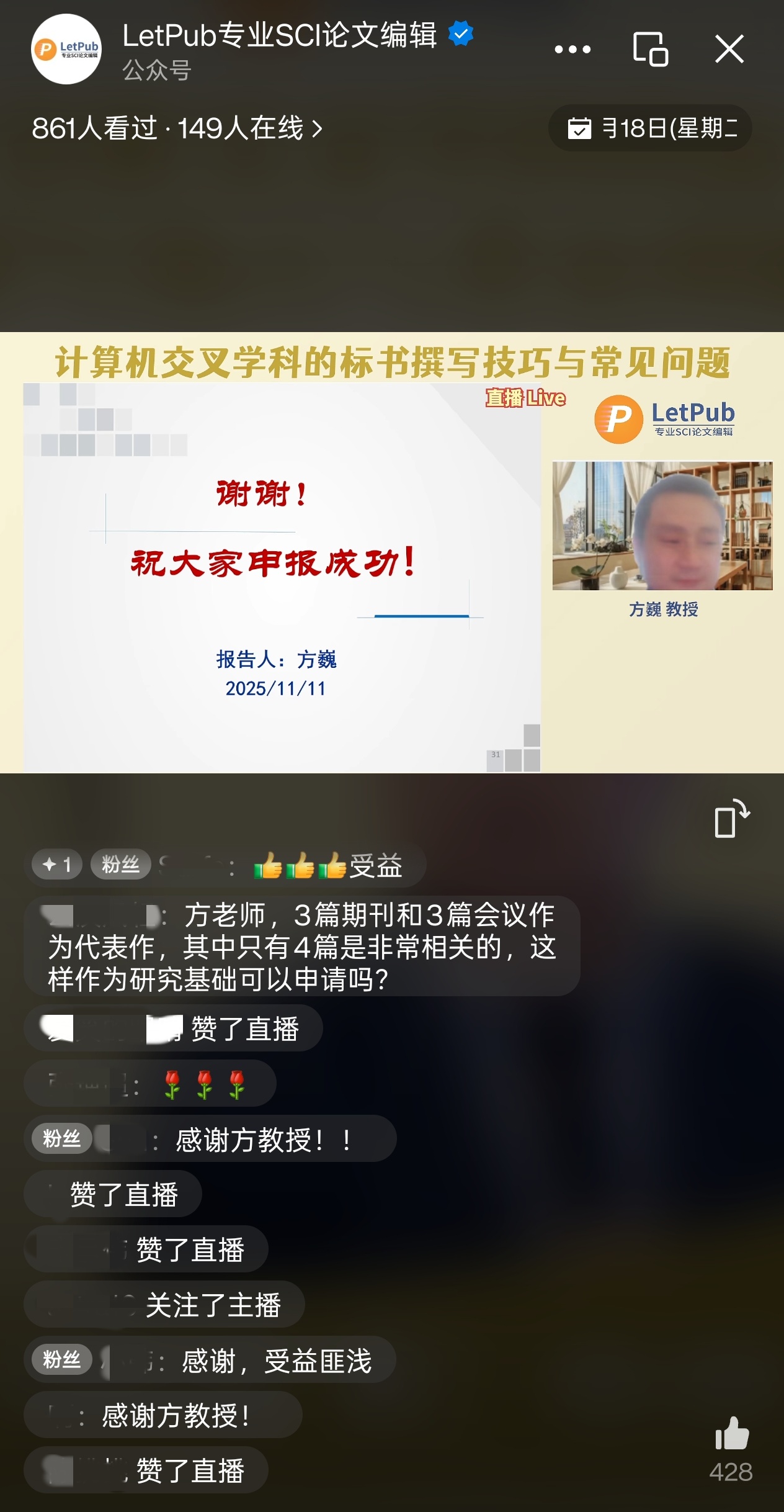 11月11日周二19:30,LetPub特邀国家自然科学基金委项目评审专家方巍教授,围绕交叉学科标书中常见的“创新点定位模糊”“技术路线描述不清”等问题,带来一场系统、实用的专题讲座。