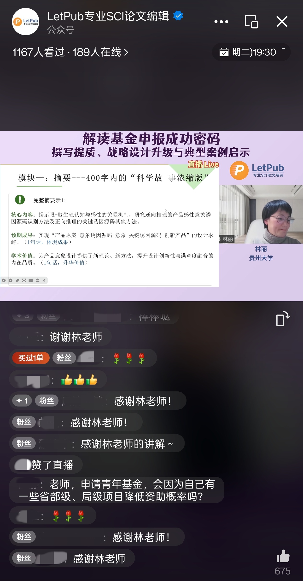 本次LetPub 特邀贵州大学机械工程学院设计学科负责人林丽教授,深度解读基金申报“成功密码”。林老师结合多项基金项目申报与评审经验,讲解了从战略价值锚定、学术逻辑构建及创新价值论证三个维度,系统拆解基金申报书的成功密码,并结合典型案例,助力研究者打造兼具“学术深度”与“战略高度”的申报文本。