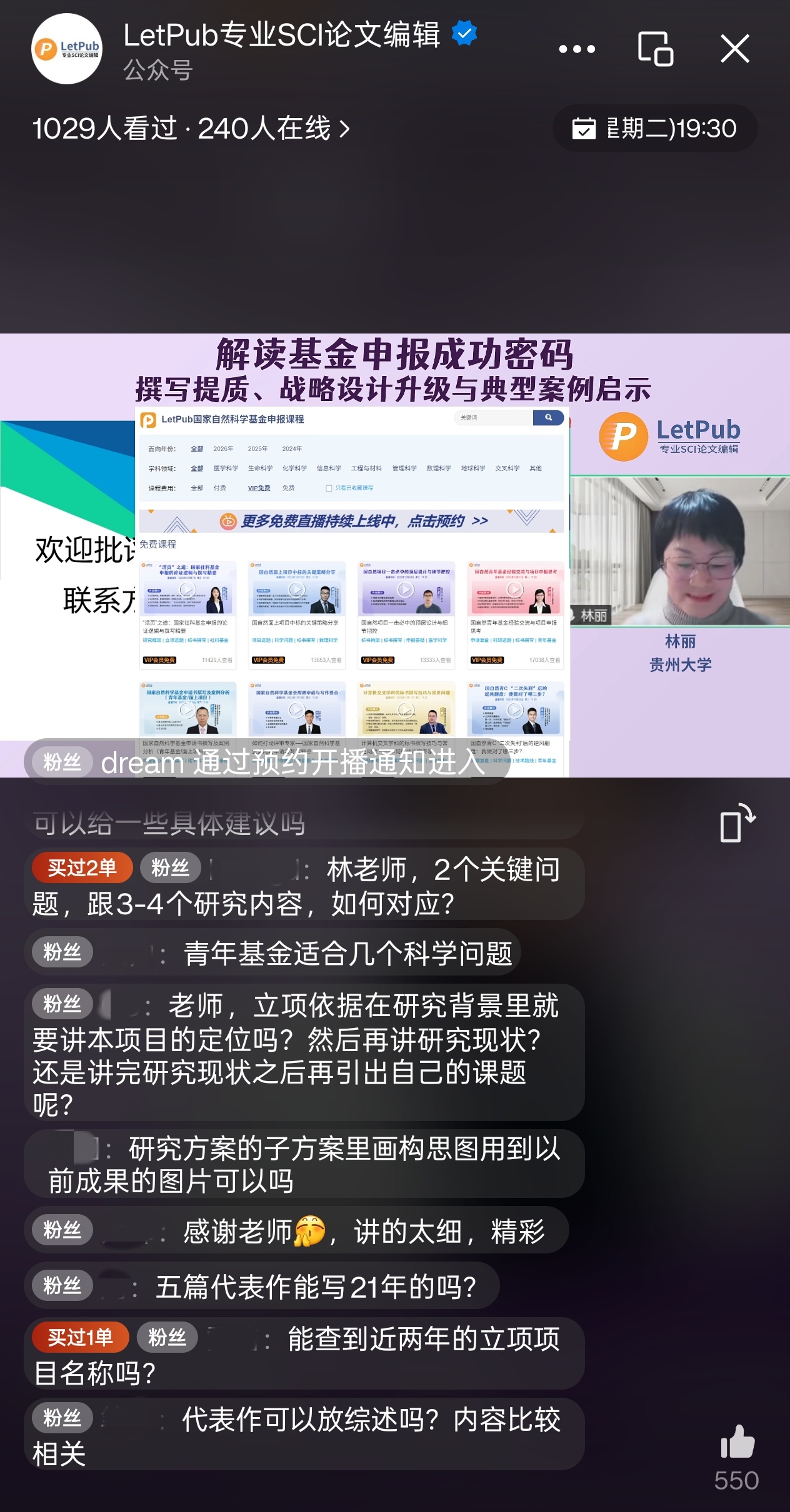 为帮助广大科研人员应对申报过程中可能遭遇的问题,LetPub精心策划了《国家自然科学基金申报攻略》系列线上辅导讲座。自2023年11月以来,我们已成功举办百余场线上免费直播,吸引了100万+名听众,反响热烈。