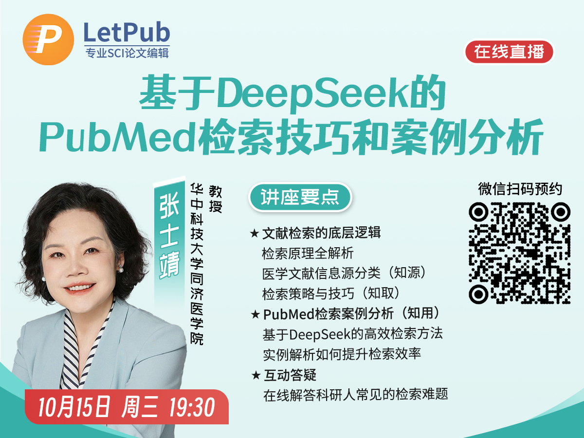 文献检索是科研的起点,也是科研效率的关键。10月15日(周三)19:30,LetPub特邀华中科技大学同济医学院医药卫生管理学院张士靖教授,为大家带来主题讲座——《基于DeepSeek的PubMed检索技巧和案例分析》。
