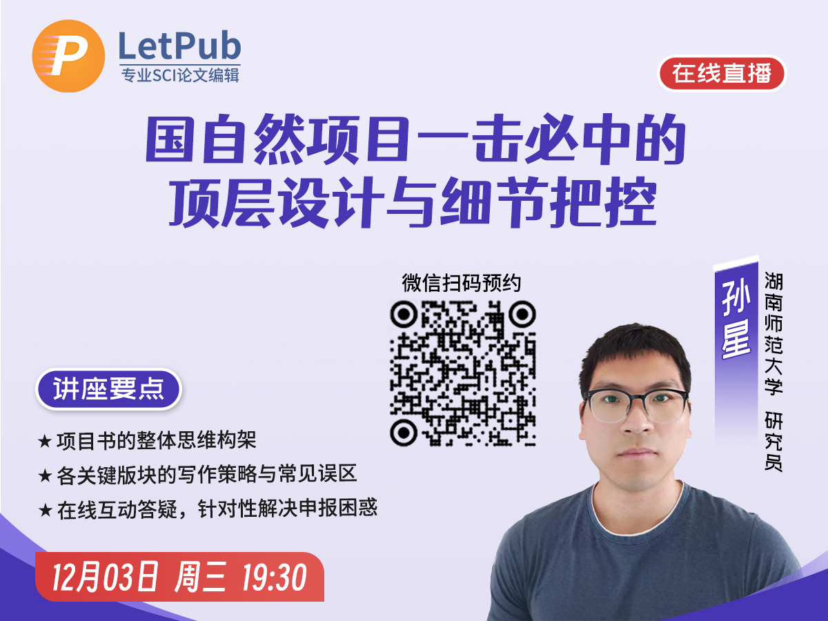 12月3日(周三)19:30,LetPub 特邀 2025年国家自然科学基金(医学科学部)面上项目获得者——湖南师范大学孙星研究员,带来一场面向青年科研人员的实战型基金写作指导课。