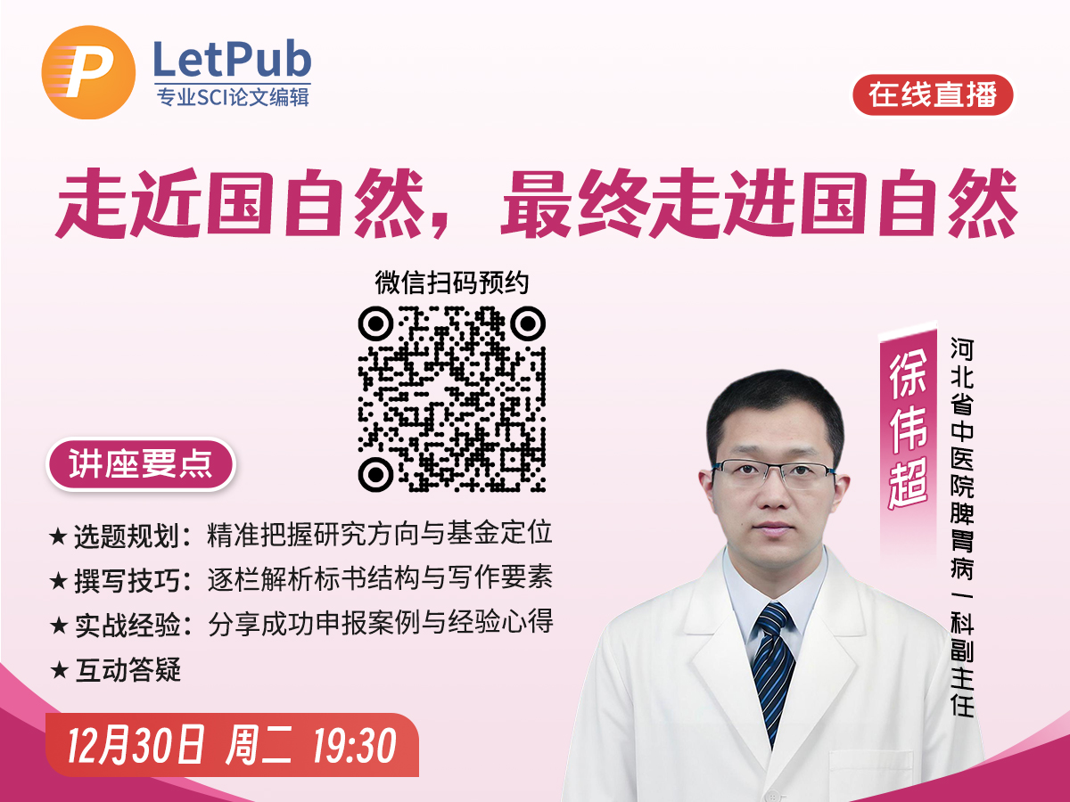 在国家自然科学基金的激烈竞争中,如何让你的申请书脱颖而出?12月30日(周二)19:30,LetPub 特邀河北省中医院脾胃病一科副主任徐伟超老师,带来一场面向青年科研人员的基金申请指导讲座。