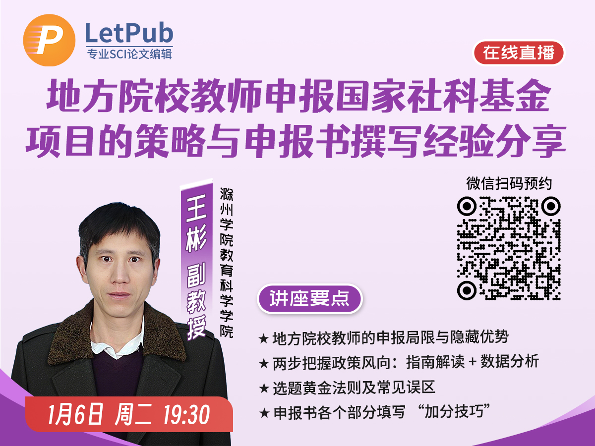 1月6日(周二)19:30,LetPub 特邀滁州学院教育科学学院副教授王彬老师,带来一场面向科研人员的国家社科基金申报指导讲座。王老师将以多年科研实践与基金申报经验为基础,从地方院校的真实处境出发,带你拆解政策风向、避开选题误区、掌握高命中率选题策略,并深度解析申报书中评委必看的关键细节。