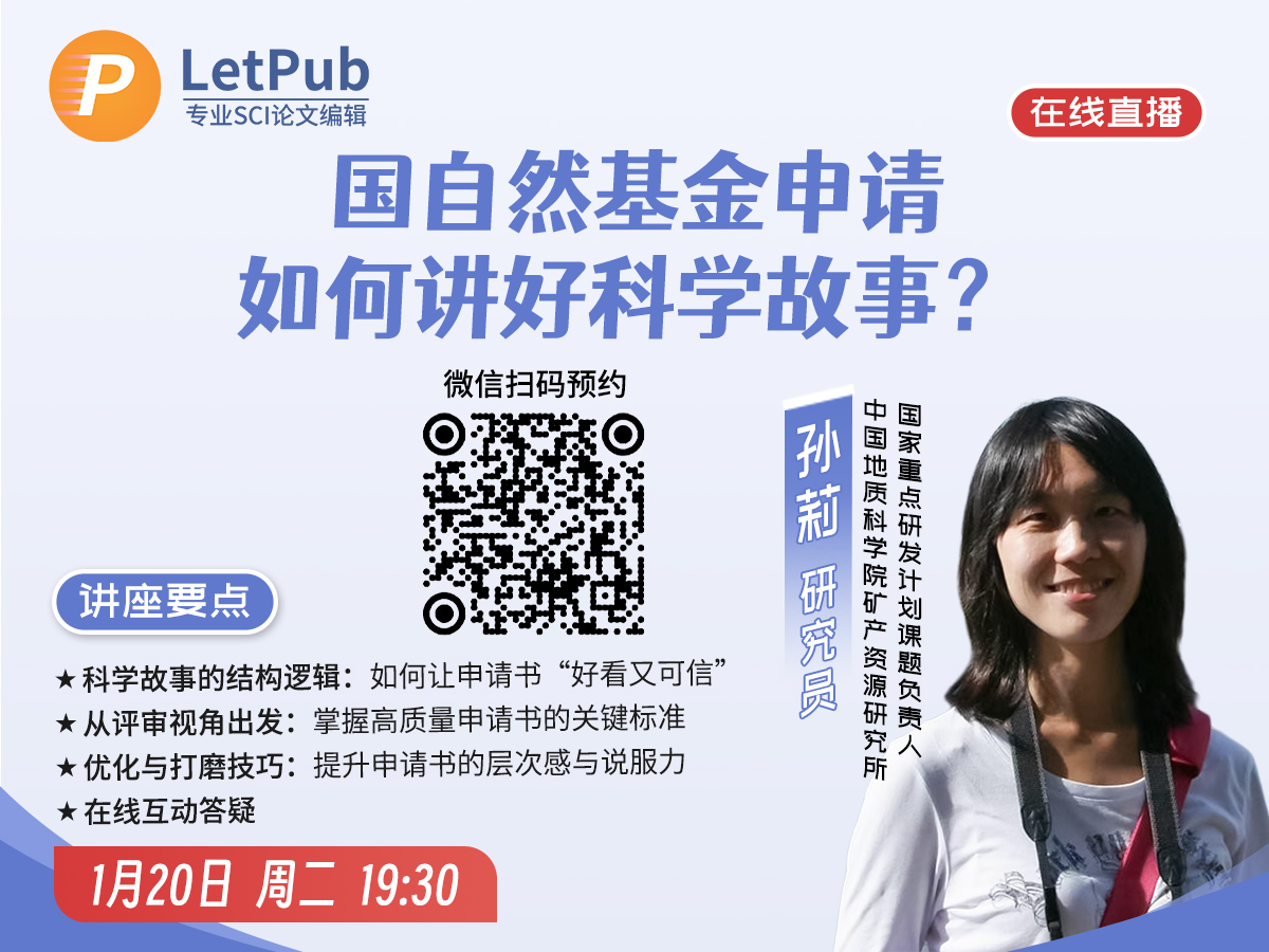 在基金申请的激烈竞争中,评审专家最期待看到的,可能不是“堆砌成果”的陈述,而是一篇逻辑清晰、科学动人的故事。1月20日(周二)19:30,LetPub 特邀国家重点研发计划课题负责人、中国地质科学院矿产资源研究所孙莉研究员,带来一场面向科研人员的实战型基金申报指导讲座。
